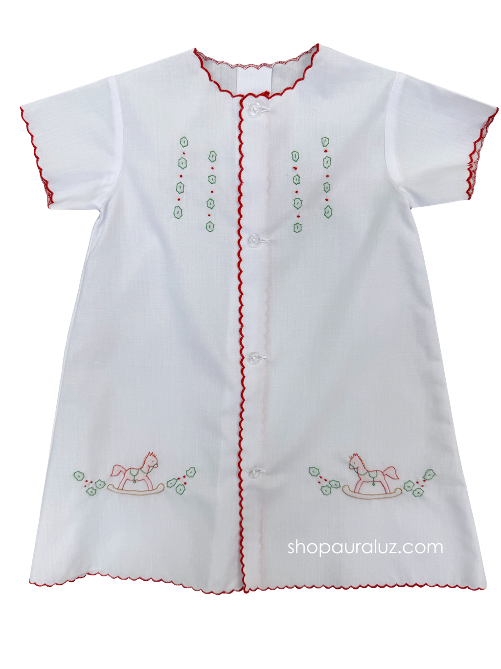 Auraluz Christmas Day Gown..White with red scallops and embroidered rocking horses