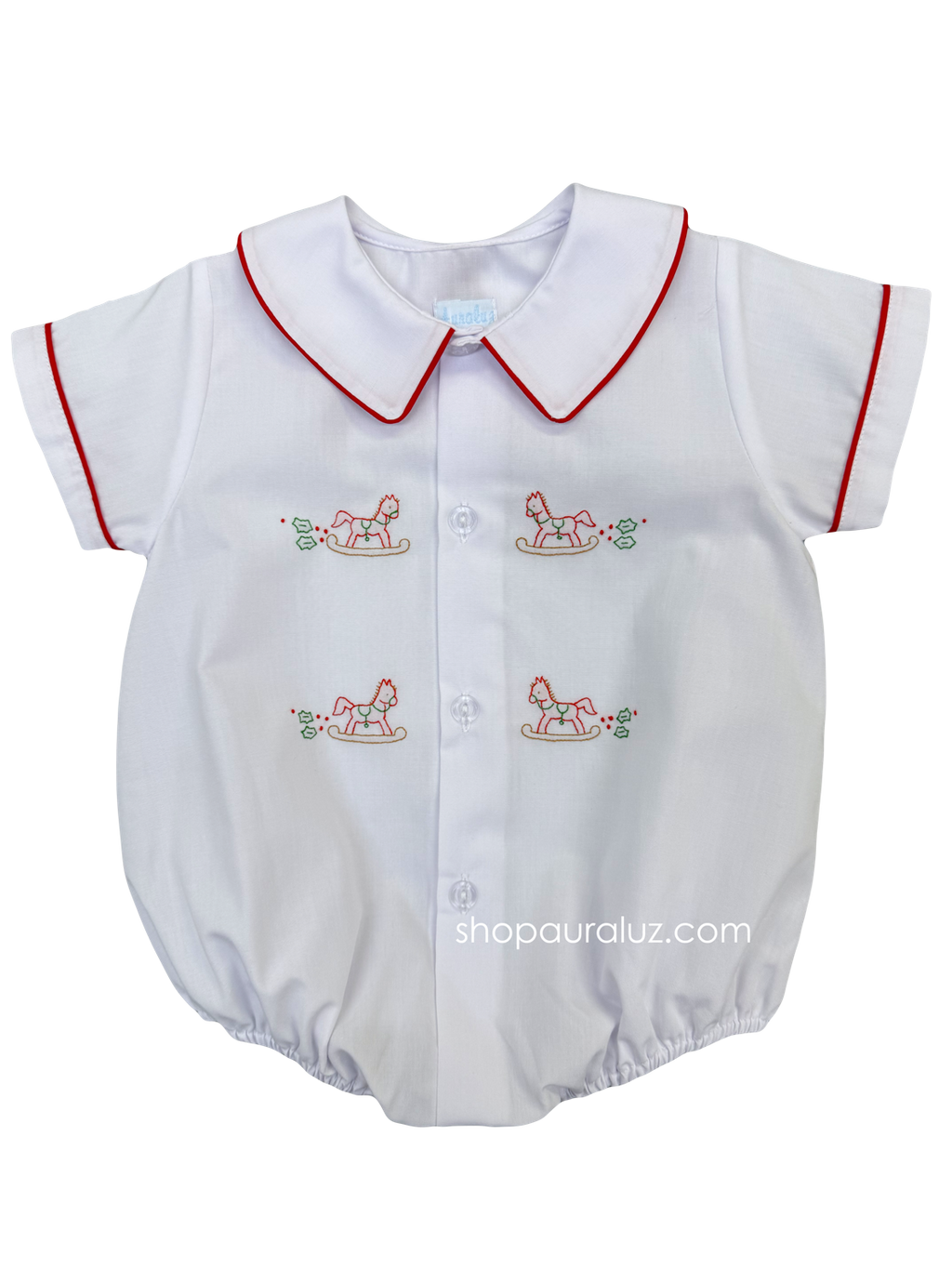 Auraluz Christmas Boy Bubble/Button-Front..White w/red binding trim and embroidered horses