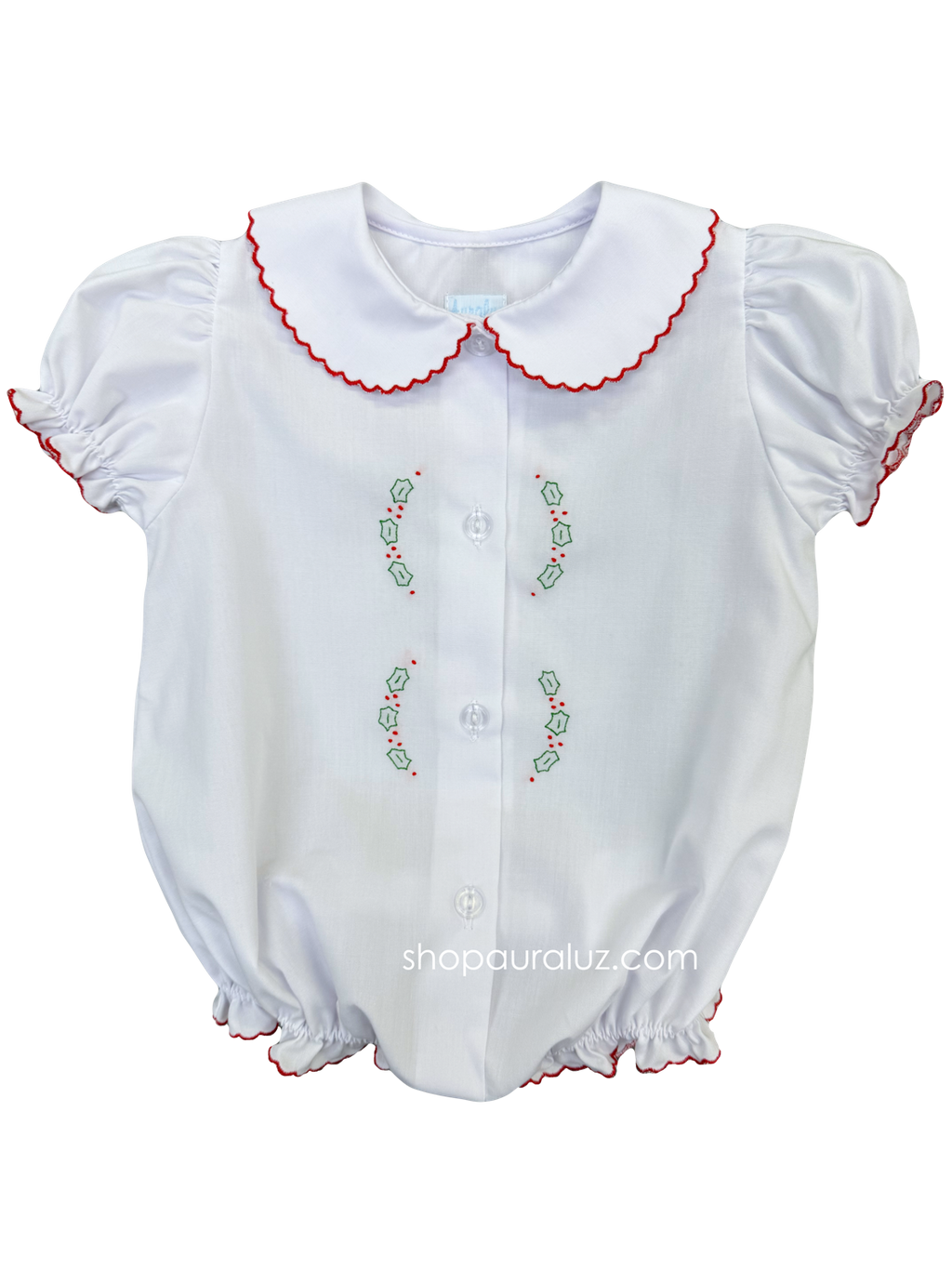 Auraluz Christmas Girl Bubble/Button-Front..White with red scallop trim and embroidered holly