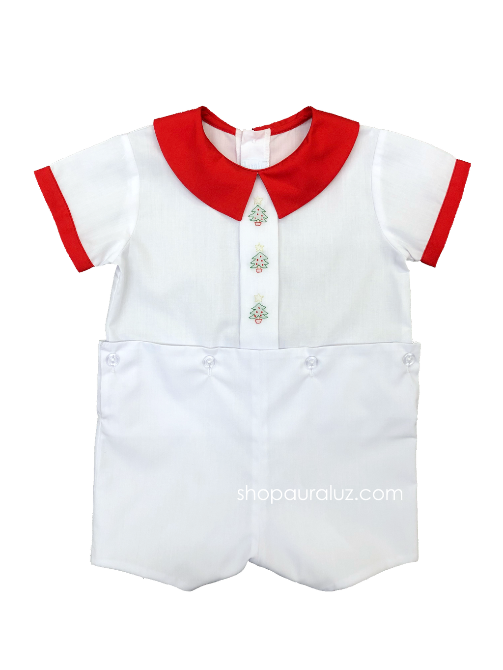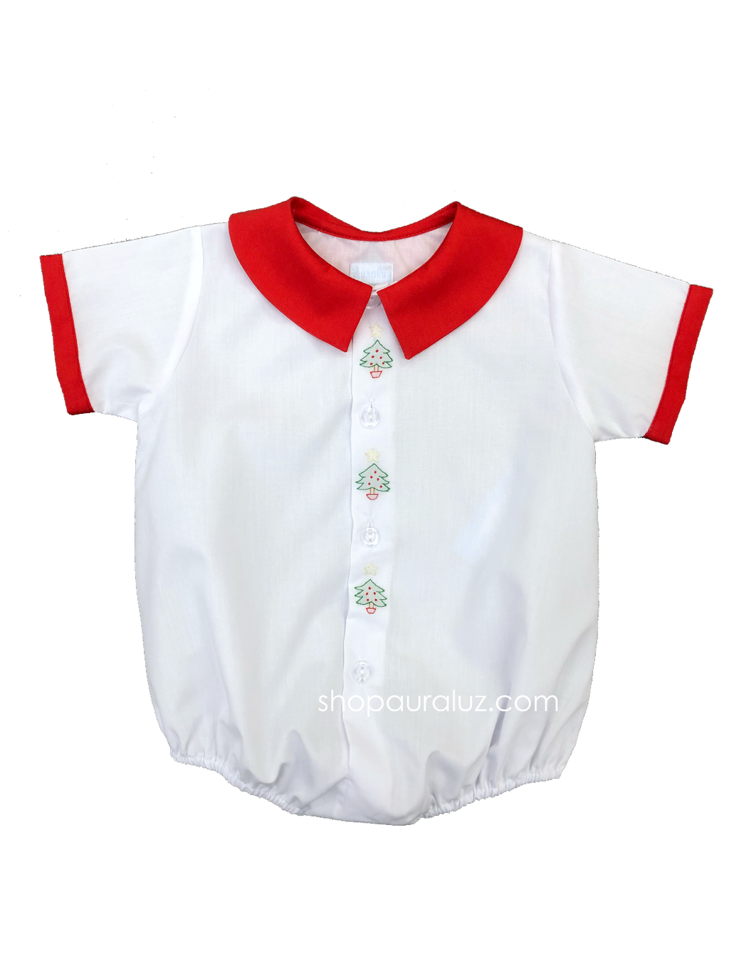 Auraluz Christmas Boy Bubble/Button-Front..White with red boy collar and embroidered trees